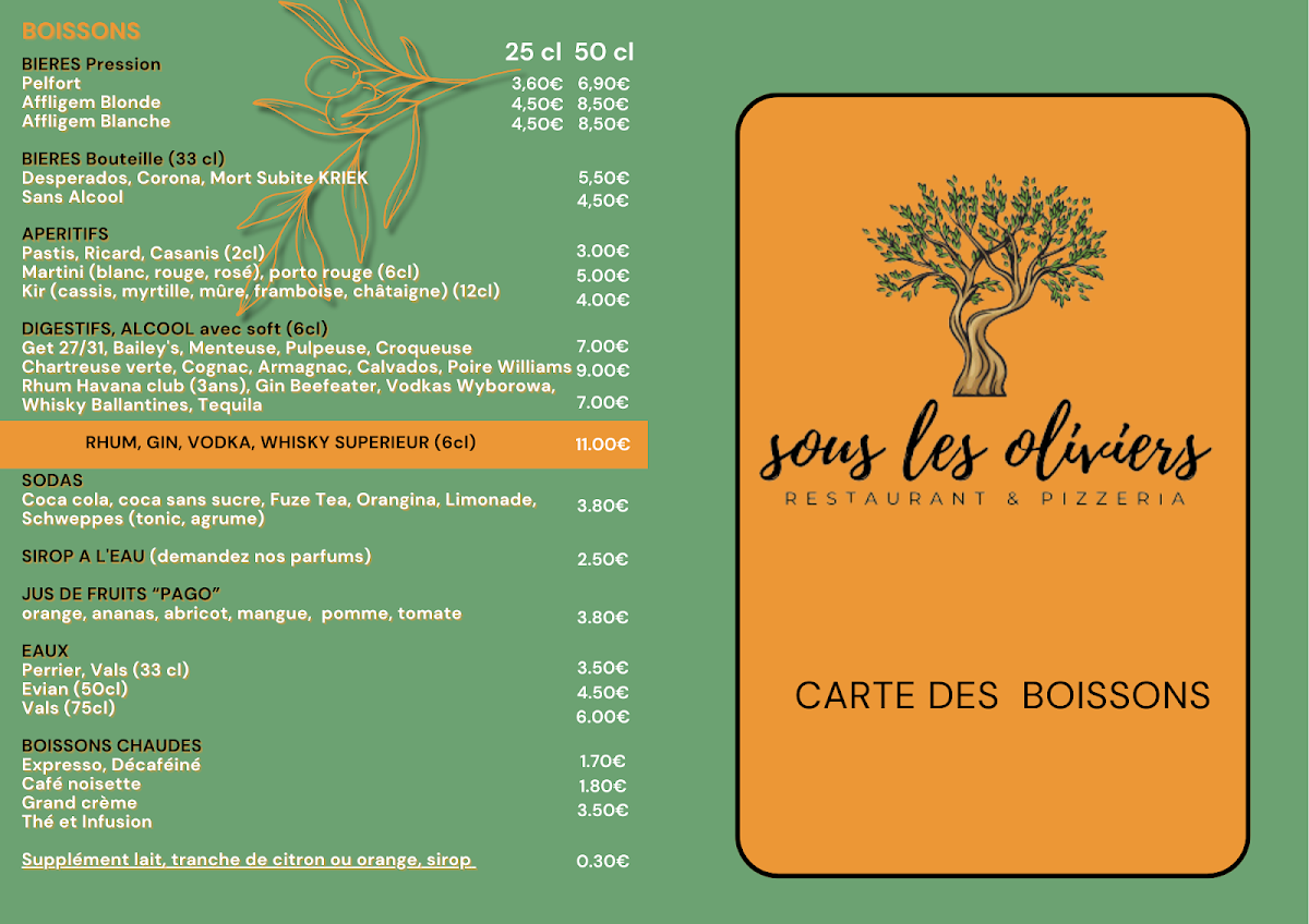 The first thing you'll notice as you approach Sous les Oliviers are the two majestic olive trees that grace the exterior, creating a serene and cozy ambiance perfect for a family meal or a night out with friends. Inside, the warmth of the decor complements the lively energy of the dining area, making you feel instantly at home.